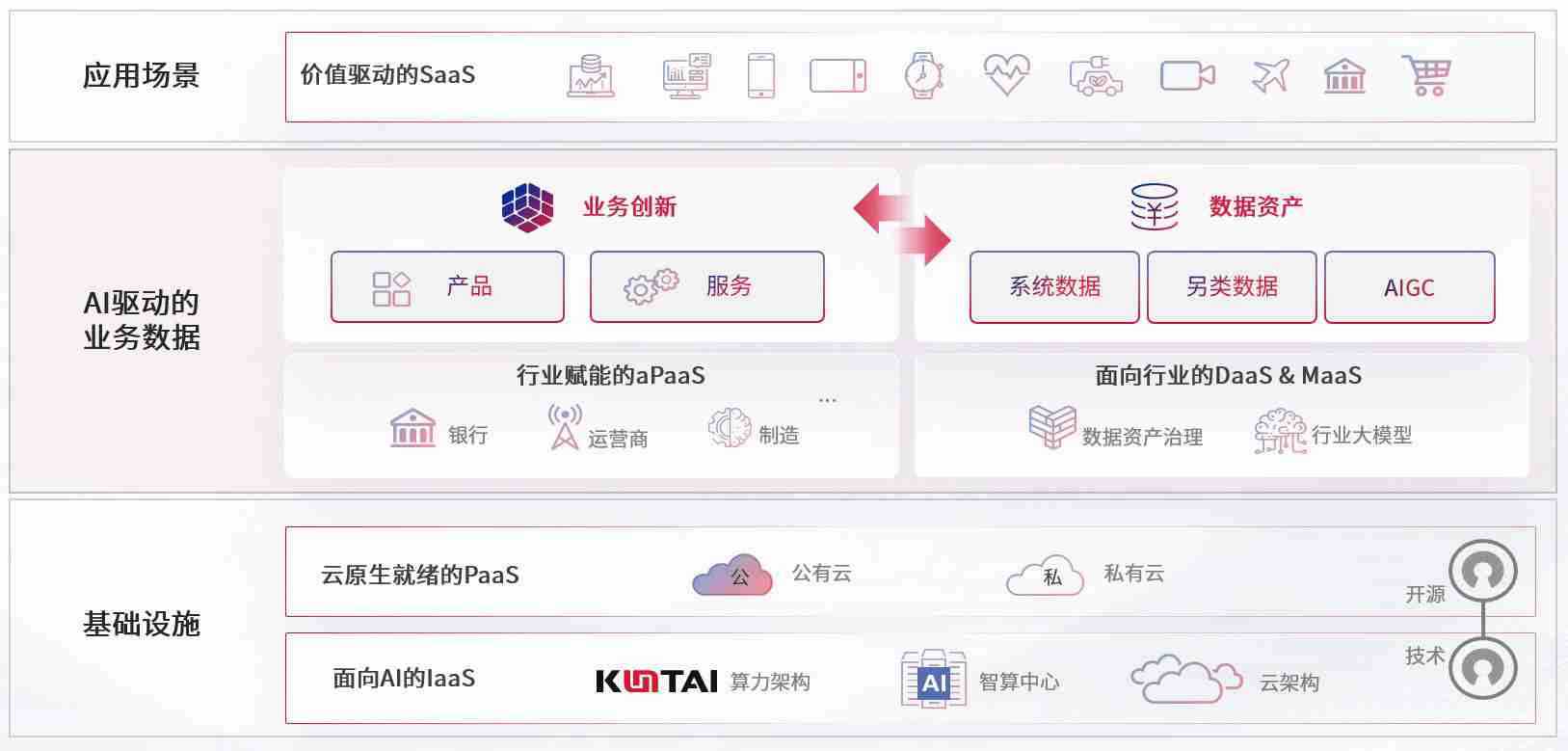 数字时代,,,,围绕企业数字化转型的关键要素,,,97622娱乐电子游戏数码开创性的提出数云融合战略和技术体系框架,,,着力在云原生、、、数字原生、、、AI原生和信创产业上架构产品和服务能力,,,为处在不同数字化转型阶段的快消零售、、汽车、、、金融、、、医疗、、、、政企、、、教育、、、运营商等行业客户提供泛在的敏捷IT能力和融合的数据驱动能力,,构建跨界融合创新的数字业务场景和新业务模式,,,,助力企业级客户建立面向未来的核心能力和竞争优势,,,,全面推动社会的数字化、、、智能化转型升级。。。。